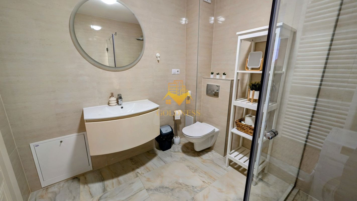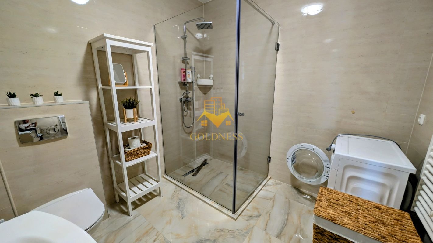 – baie cu cabina de dus, calorifer port prosop și dulap pentru depozitare.