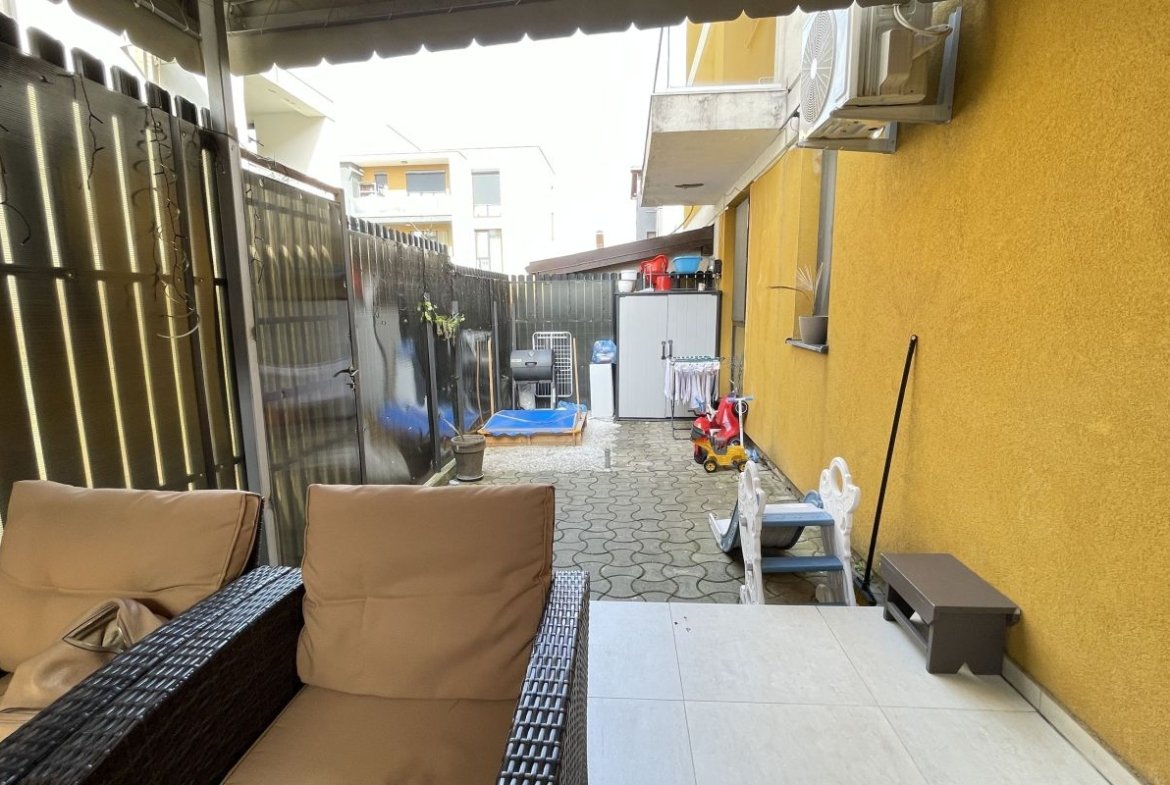 Apartamentul beneficiază de o curte proprie perfectă pentru relaxare, fiind delimitată și amenajată oferind intimitate față de vecini.