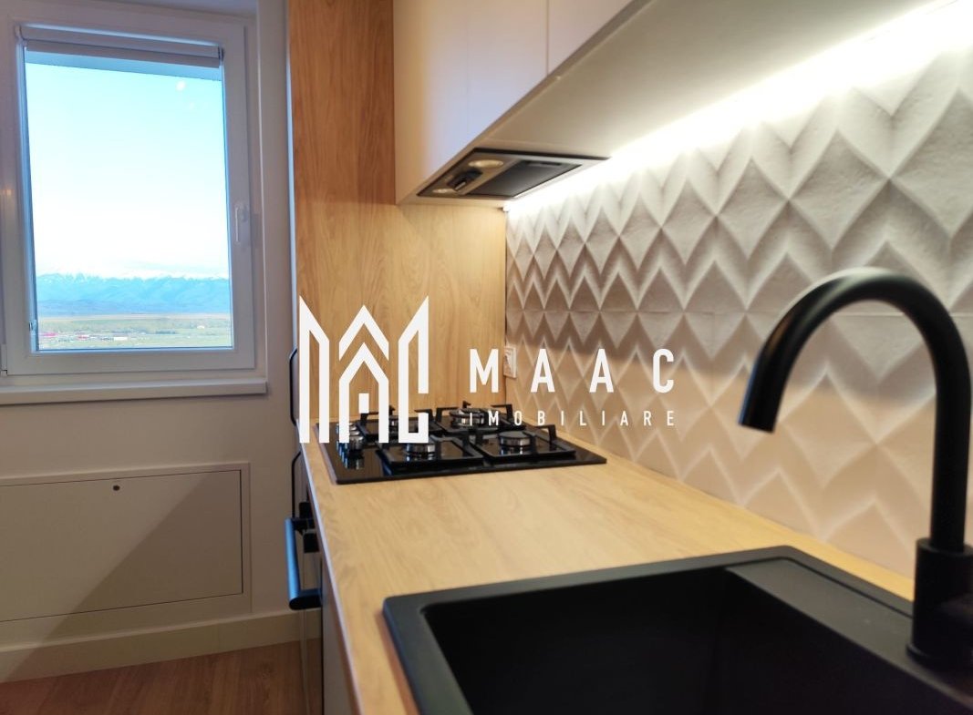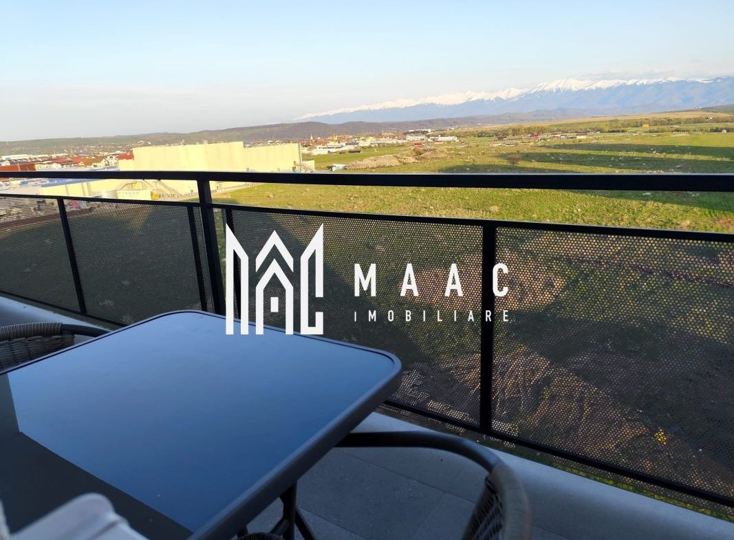 Poziționat la etajul 8 din 10, apartamentul oferă o vedere panoramică asupra munților Făgăraș și a orașului.