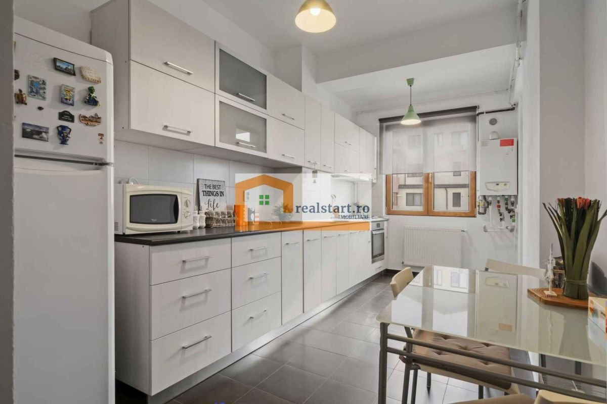 – blocul in care se afla apartamentul este ingrijit, iar ca pozitie este optim amplasat: retras de zgomotul si poluarea stradala, insa aproape de toate facilitatile zonei: vis a vis este un parculet, iar la 2-3 min de mers pe jos exista o mini-piata, magazine diverse (Penny, Mega, farmacii), sala de sport, scoli si gradinite si acces facil catre mijloace de transport