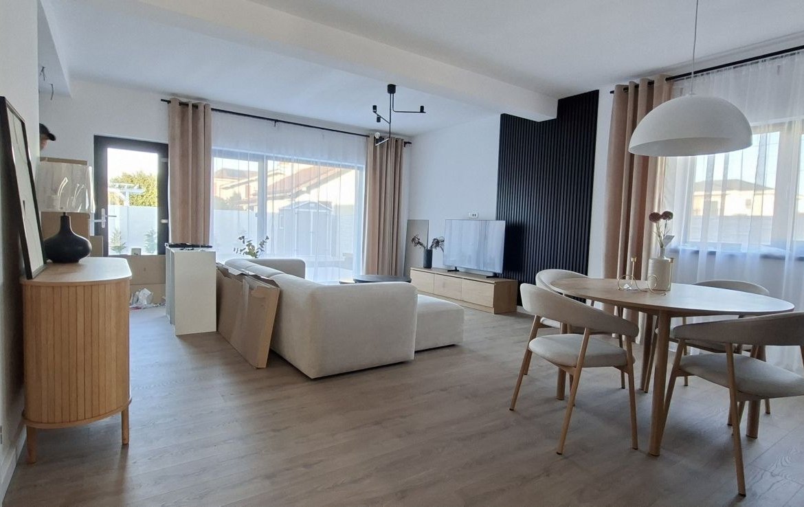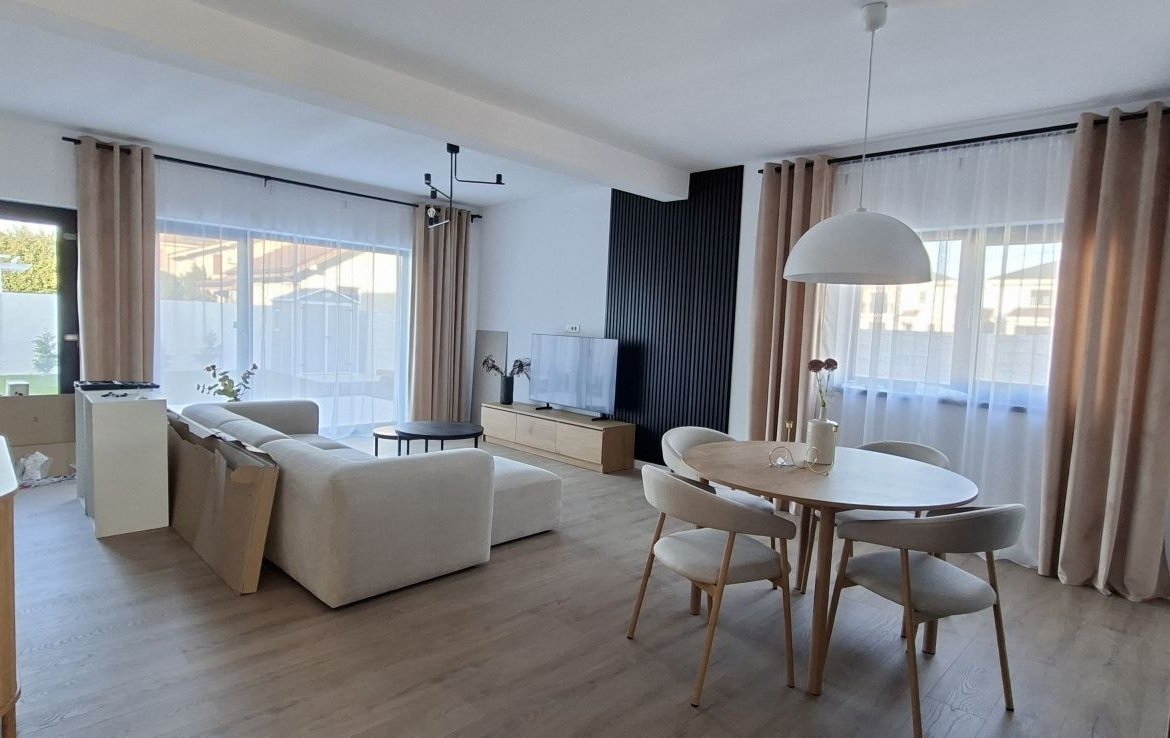 Dotari: incalzire in pardoseala, centrala termica in condensatie pe gaz, casa este izolata cu polistiren de 15cm, 3 aparate de aer conditionat, unul la parter si 2 la etaj, electrocasnice Bosch, Electrolux si Beko, curtea amenajata cu gazon rulou si plante, cu foraj si sistem de irigatie.