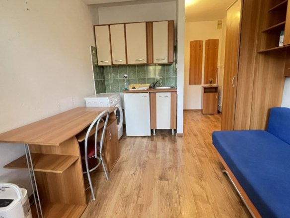 Zona de living/dormitor este amenajată cu canapea, comodă cu televizor și dulap generos pentru depozitare. Bucătăria este dotată cu chiuvetă, frigider și mașină de spălat, oferind toate facilitățile necesare. Baia este proprie și dispune de duș, chiuvetă și toaletă.
