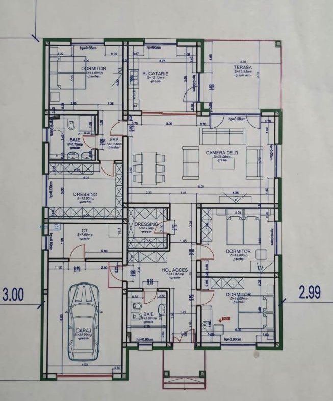 Hol intrare – baie cu dus, hol spre garaj, garaj, spatiu tehnic, 2 dormitoare, dressing, living cu loc de luat masa, bucatarie, dormitor matrimonial, cu baie proprie si dressing/dormitor 4( suprafata fiind de 12mp) si terasa acoperita accesibila din bucatarie si living.