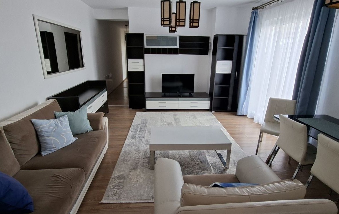 ✔ Compartimentare: living generos cu acces pe terasă, bucătărie complet utilată, 2 dormitoare, 2 băi.