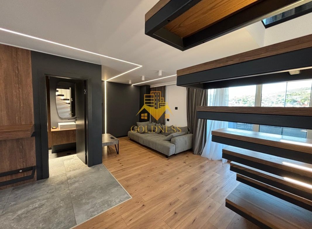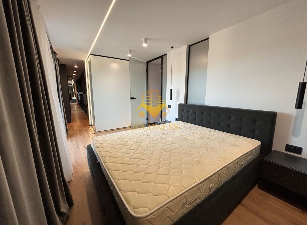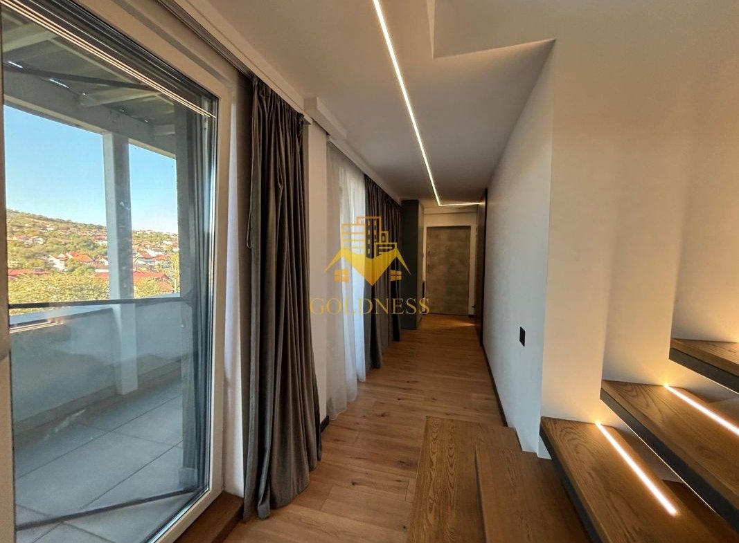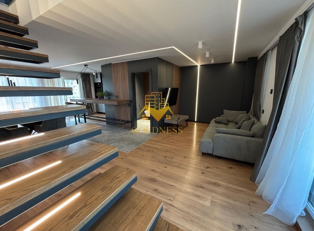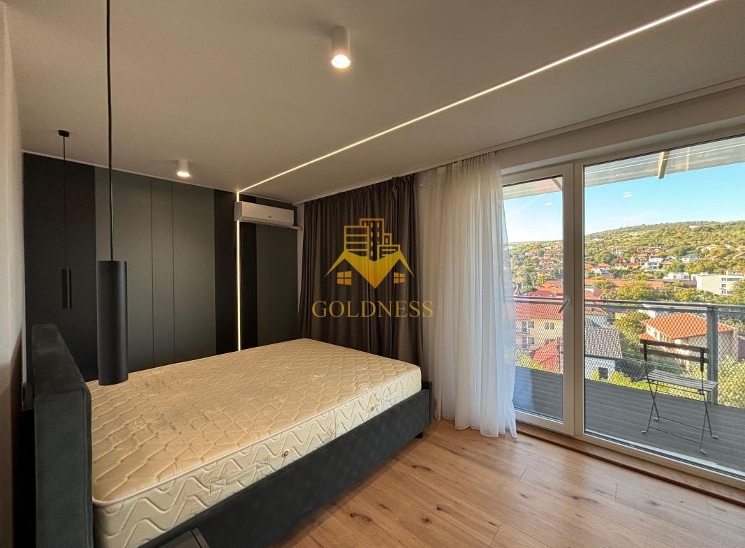 GOLDNESS Imobiliare vă propune spre închiriere penthouse cu panorama superba la 3 minute de centru, situat intr-o zona linistita. Penthouse-ul cu finisaje de lux este situat la etajul 4 al unui imobil constructie noua cu 4 etaje, dotat cu lift si videointerfon, dispus pe doua niveluri si are urmatoarea compartimentare: la primul nivel regasim un hol, un living luminos impreuna cu bucataria si zona de luat masa cu iesire pe o terasa de 24mp si un balcon de 5 mp, baie iar la al doilea nivel sunt doua dormitoare, din care unul cu dressing si o baie care deserveste cele doua dormitoare, hol, terasa de 24 mp si un balcon de 5 mp. Suprafata utila a apartamentului este de 115 mp, iar suprafata totala a teraselor este de 58 mp.