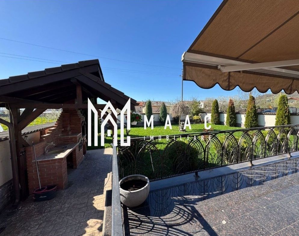 Exteriorul este atent amenajat: curte cu gazon și arbori decorativi, sistem de irigație automat, terasă și balcoane placate cu granit, zonă de grătar cu cuptor pe lemne, gard solid din cărămidă, porți electrice cu control prin telefon și iluminat ambiental.